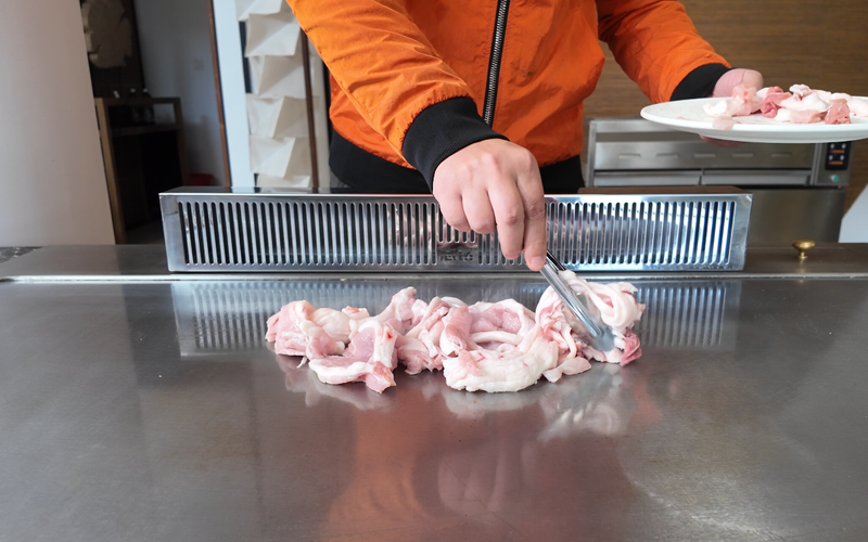 4、溫度升至220度后,將1000g五花肉放置在煎板上,不斷翻炒,用高溫練出五花肉的油脂;